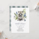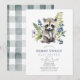 This cute "berry sweet" boy's baby shower invitation features a baby raccoon, greenery, blueberries, and a purple flower in watercolor. The reverse side features a white background with dusty blue gingham/buffalo plaid/check. Personalize it for your needs. You can find more bunny products at my store.