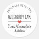 Simple "homemade with love" sticker featuring "blueberry jam" with a black font on a simple white background embellished by a cute red heart. Customise text.