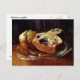 This postcard features mouth-watering blueberry muffins arranged on a shiny glass plate on a wooden table. The background is draped in a deep purple fabric.