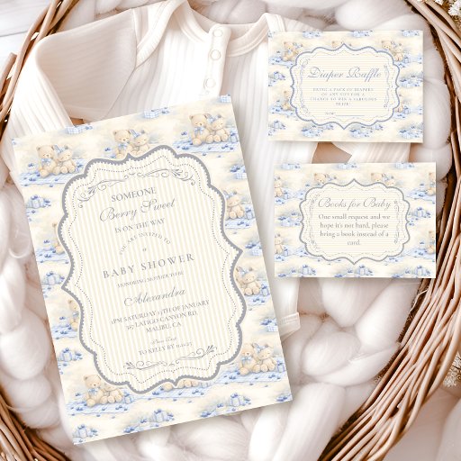 Blueberry Teddy Gift Toile Baby Shower Invitation