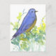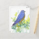 A postcard decorated with a bright blue mountain bluebird standing on a sagebrush bush illustrated with sepia ink and watercolor. Inspired by the Nevada state bird and Nevada state flower.