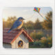 A bluebird sits on a wooden birdhouse, holding a kite string in its beak, while another bluebird peeks out from the opening, framed by a blurred garden backdrop
