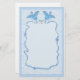 Lovely and romantic stationery features a pair of flying bluebirds with ribbon and wedding rings in their beaks. Blue ribbon border and blue textured border.