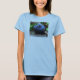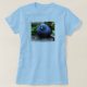 A grouchy looking blue bird on women's blue tshirt. Caption: Do I look like the bluebird of happiness?