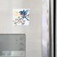 This watercolor bluebird square magnet features a vibrant blue songbird perched on a blooming branch beneath a soft golden sun. Delicate blue blossoms and warm botanical accents create a serene spring-inspired composition that brings a touch of nature indoors.