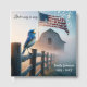 A bluebird is perched on a wooden fence post with musical notes and symbols flowing from its beak and a rustic old farm barn with an American flag. Can be used for funeral or memorial service.