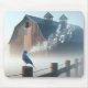 A bluebird is perched on a wooden fence post with musical notes and symbols flowing from its beak and a rustic old farm barn with an American flag