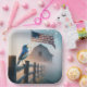 A bluebird perches on a wooden fence post, singing with musical notes flowing from its beak with American flag fluttering in the background