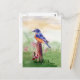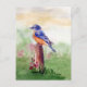 From an original watercolor painting by Brenda Thour of a beautiful bluebird sitting on a post in blues, greens, oranges, browns with a splash of red flowers at the base of the post. Copyright by Brenda Thour 2009.