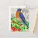 A collage art post card decorated with a bluebird perched on a tree branch blooming with white flowers accented with red roses and tree branches drawn in black pen and ink on a damask style French script background.