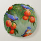 Two western bluebirds perch in a peach tree while a third bluebird sits on a woven wooden basket filled with freshly harvested fruit ready for market.