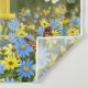 A pair of eastern bluebirds make their home in a cute yellow birdhouse within a beautiful spring garden filled blue and yellow daisies and surrounded by flowering dogwood. Orange and blue butterflies visit the flowers, too. Original artwork created by wildlife artist Crista S. Forest.