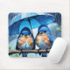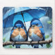 Pair of bluebirds under a blue umbrella in a rainstorm