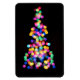 Celebrate the winter holiday season with this original, colourful, abstract photo of blurred Christmas lights. The bokeh created from the pink, red, orange, blue, green, and yellow lights form the shape of a Christmas tree. The background of the vertical image is black.