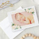 This elegant photo birth announcement card introduces your beautiful baby girl with a newborn photo and stylish real gold foil text that can be personalised to feature your baby's name in script, along with important birth information, and parent names. The photo is accented with a floral peony and woodland greenery watercolor design in cream, gold, blush, peach, and green colours. A pattern of white horizontal stripes dresses up the back of the card. The blush peach / pink background colour can be modified.