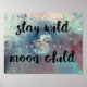 A quote reading 'stay wild moon child' in black against a pale pink and dull blue grunge full moon background, embellished with a pretty pink scrollwork swirl.
