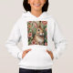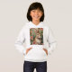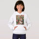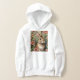 The Blush Blooms and Bunny Dreams hoodie features a pure white rabbit in a lush pink floral garden with fresh carrots, creating a charming and stylish Easter look perfect for springtime fashion.