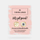 Acrylic let's get social sign with your logo and QR code printed on blush pink printed paint hastily brushed over the acrylic surface with faux gold foil details your hashtags and your social media handle. Social media promotional sign with black fonts and blush pink paint strokes printed on an acrylic background personalised with your QR code and social media handle so your clients and customers can easily access your social media as well as your business logo. Blush pink acrylic social media sign for your salon or small business for promotional purposes to help your customers and clients find you online by scanning your QR code.
