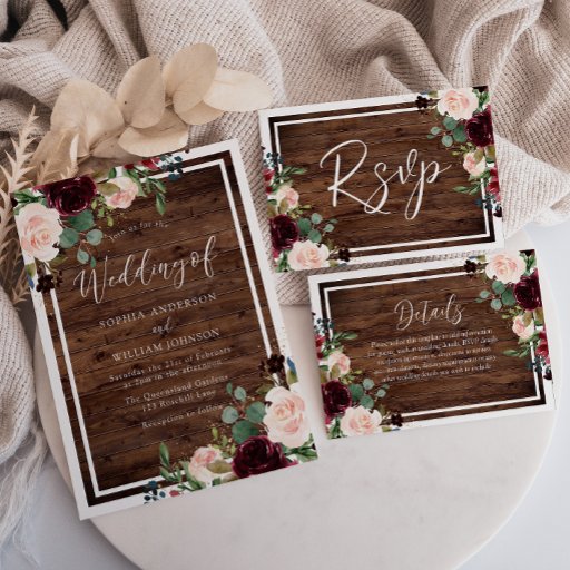Blush & Burgundy Watercolor Rustic Wood Wedding Invitation