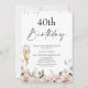 Floral themed birthday party invitation featuring a lovely floral arrangement with blush colored flowers and eucalyptus foliage. This boho floral birthday invitation also features some faux gold glitter dots and a modern calligraphy font image heading.