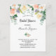 A trendy bright colourful floral bridal shower invitation in blush pink, rose gold and white. A classic white background on the front. Decorated with large, lush watercolored flowers, florals in white, rose gold, blush pink with some eucaluptus greenery. Personalise and add the name of the bride to be and party details. Black text.