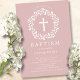 Beautiful baptism invitations featuring a delicate floral wreath and cross set on a blush pink background. Flip our invitation over to view a coordinating back for an extra special touch. Visit our shop to view our entire religious collection.