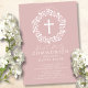 Beautiful First Communion invitations featuring a delicate floral wreath and cross set on a blush pink background. Flip our invitation over to view a coordinating back for an extra special touch. Visit our shop to view our entire religious collection.