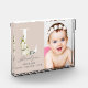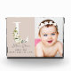 A beautiful, elegant baby girl birth stats photo acrylic block keepsake. This design features a beautiful blush pink background, and the baby's name initial L in white, and decorated with beautiful watercolor white roses and eucalyptus greenery. The baby's name is written below in hand lettered script typography, followed by baby's birth date and birth statistics. Baby's vertical orientation photo is displayed on the right. Copyright Personalised Home Decor, all rights reserved.