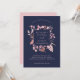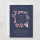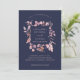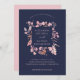 This lovely and stylish botanical wedding invitation features a trendy frame full of pink and blush watercolor leaves on a rich midnight blue background, and a blush pink colour on the back of the card.