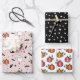 Cute Halloween wrapping paper sheets perfect for pumpkin themed baby showers, Halloween baby showers, pumpkin themed birthdays, Halloween birthdays, Halloween parties, and more with three matching patterns in pink and orange: one with ghosts, bats, pumpkins and stars; one with black and white stars; and one with pumpkins in pink and orange against a white background.