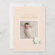 This stylish baptism ceremony and lunch celebration invitation for a baby girl features elegant custom wording for your special event accented by a gold cross and beautiful floral watercolor border design with painted roses, ranunculus flowers, and greenery in neutral shades of white, cream, gold, rose gold, and green. A pastel blush peach background with newborn photo space appear on the back of the card. Personalise the "God Bless" text with baby's name in script.