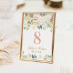 Woodsy romantic style wedding table number cards feature numbers framed by a floral watercolor wreath with painted roses, ranunculus flowers, and leaves. Colour scheme includes neutral shades of white, cream, blush pink, gold, and green. Perfect for a spring or summer event.