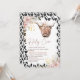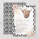 Sweet highland cow baby shower invitation in a bohemian or chic style featuring two blush and gold floral arrangements, black cow print pattern and a highland cow. This boho floral holy cow baby shower invitation is ideal for a highland cow themed baby shower.