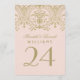 Elegant vintage inspired table numbers feature a wedding monogram and an ornate decorative border design with a metallic antique gold shimmer appearance and light blush pink background colour. Two-sided design. Customise and add each table number card to your shopping cart individually.