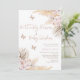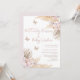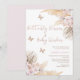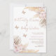 Modern butterfly kisses and baby wishes baby shower invitation featuring a bohemian style blush floral arrangements with pampas grass and a rose gold calligraphy heading. The design also features three faux light rose gold glitter butterflies.
