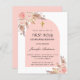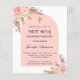 An arch frame decorated with rose gold and blush pink florals, roses and pampas grass. Personalise and add a name and details.