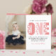 Modern, simple and elegant girl first birthday thank you postcard. Design featuring blush pink typography one , thank you message and a photo.