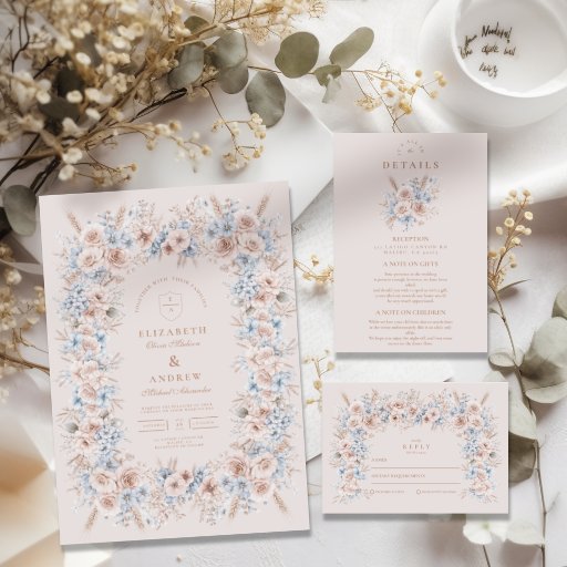 Part of a Full Suite: Coordinates perfectly with our Blush Pink and Blue Watercolor Floral invitations, RSVP cards, menus, and more.
