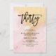 This glam and stylish 30th birthday party invitation features a blush pink and faux gold marble look background, with trendy script typography in black.