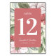 A wedding table number card featuring an elegant autumn floral background using the colours, blush pink, sage green, and dark rose. The design features a solid dark rose pink in the centre of the card.