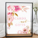 Welcome your guests in style with this blush pink and gold floral "Cards and Gifts" sign. Featuring soft watercolor florals and faux gold glitter accents, this elegant sign is perfect for your baby girl shower setup. Simply frame and display on a welcome table to add a thoughtful and cohesive touch to your decor.