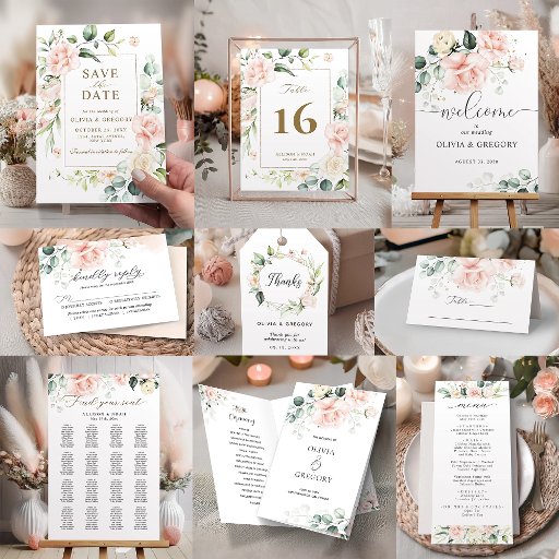 The wedding theme with the motif of blush pink flowers and leaves contains love and natural beauty.