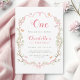 This 1st birthday invitation features pink blossom floral frame adorned with bows and butterflies.