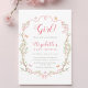 This girl baby shower invitation features a pink and green blossom floral frame adorned with butterflies and ribbons.