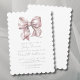 This charming baby shower invitation features a pale light blush pink bow with a scalloped edge for an extra touch of cuteness. The design showcases a simple, classic baby shower look with grey text in a mix of serif and calligraphy script typography. Celebrate the mum-to-be in style! You can customise the font colours and background colours on both sides. Ideal for year-round baby showers, especially for a garden party or brunch. Easy to decorate with pink ribbons and bows or other themes. Scallop Edge Simple Watercolor Pink Bow Baby Shower Invitation with Elegant Script Typography.