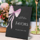This stunning pedestal sign features a sleek black backdrop, creating a bold and contemporary foundation. A beautiful blush pink bow takes a prominent place, its delicate strokes symbolising the joyous union and adding a vibrant pop of colour against the black. The Guest of Honour's Name is prominently displayed in white script, ensuring a personal touch. The words "Bridal Shower" are elegantly presented in a refined white script, setting the context for the celebration. The word "FAVORS" is then clearly and beautifully placed in elegant, bold white script, immediately drawing attention to the delightful gifts. To complete the thoughtful presentation, the instruction "PLEASE TAKE ONE" is gracefully included in white script, ensuring guests know to enjoy their special token. The overall aesthetic is one of bold romance, modern love, and striking detail, making this sign a sophisticated and functional addition to your favour display.