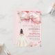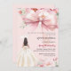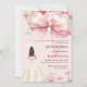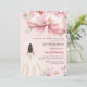 An elegant blush pink background, decorated with a large pink bow, pink flowers and a girl in a cream coloured dress. Personalise and add a name and party details.