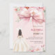 An elegant blush pink background, decorated with a large pink bow, pink flowers and a girl in a cream coloured dress. Personalise and add a name and party details.