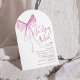 The front of this unique arch-shaped invitation offers a pristine white backdrop, creating a clean and luminous foundation. A beautiful blush pink watercolor bow takes its prominent place, its soft, artistic brushstrokes adding a touch of romance and symbolic charm. The delightful phrase "She's tying the knot" is elegantly scripted, perfectly complementing the bow. All essential event details—including the bride's name, date, time, location, and RSVP information—are thoughtfully arranged below in a clear, readable font, ensuring every detail stands out against the bright white.