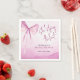 Each napkin showcases a delightful design set against a soft and inviting pink watercolor backdrop. This artistic wash of pink includes subtle variations and textures inherent in watercolor painting, giving the napkins a luxurious, hand-painted feel. A beautiful blush pink watercolor bow takes a prominent place, its delicate strokes symbolising the joyous union and adding a sweet, romantic accent. The celebratory phrase "She's tying the knot" is gracefully incorporated, setting the theme perfectly. Below this, you'll find space to personalise with the Guest of Honour's Name, ensuring a personal touch. The words "Bridal Shower" are elegantly presented in a refined script, and the date of the event is also included, completing this thoughtful design. The overall aesthetic is one of pure romance, love, and charming detail, making these napkins a beautiful complement to your table setting.